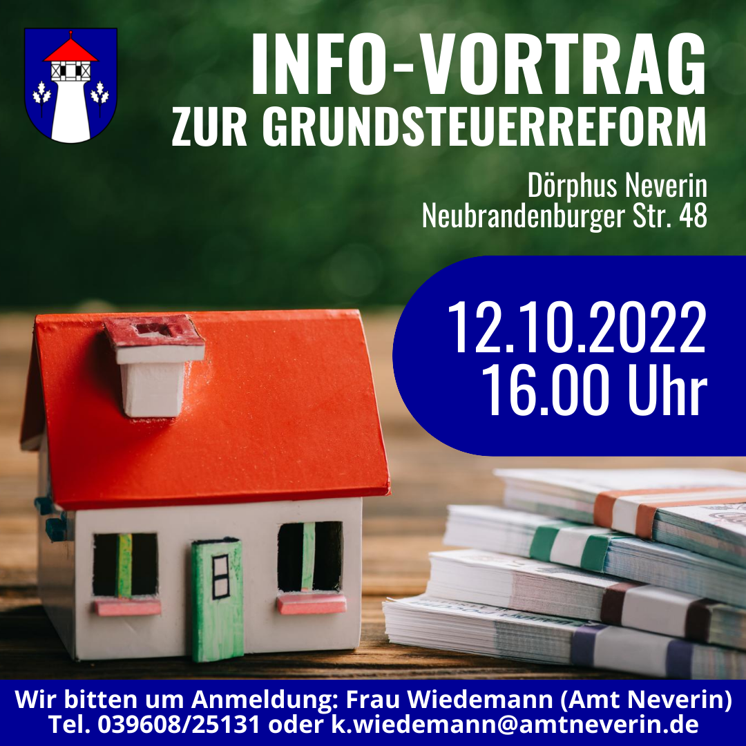 das Neubrandenburger Finanzamt bietet am 12.10.2022 eine Informationsveranstaltung zum Thema Grundsteuerreform für interessierte Grundstückseigentümer in Neverin an.