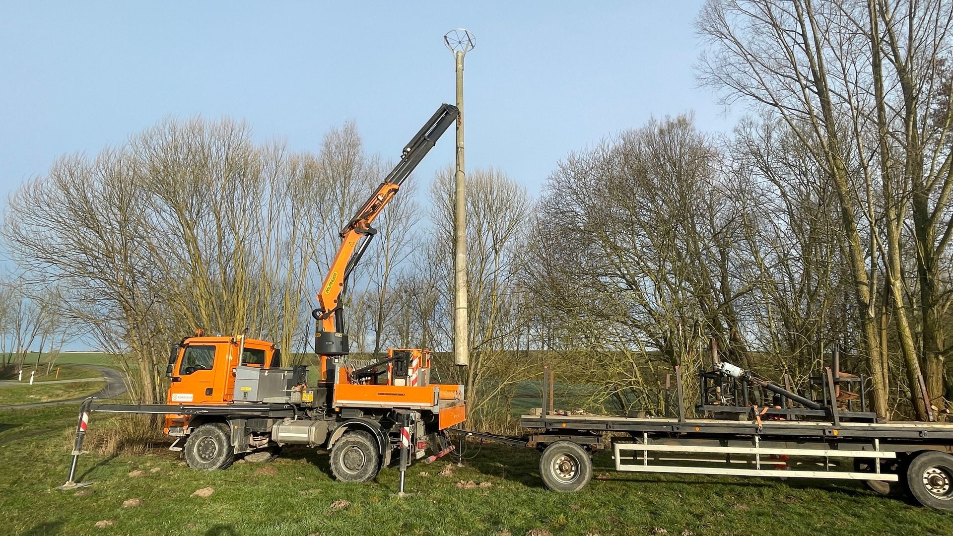 2022 gewann der Neveriner Christian Peters die zweite Auflage unserer Aktion Dein Projekt, Deine Chance . Mit 66 Stimmen sicherte er sich den ersten Platz und die Gunst der Einwohnerinnen und Einwohner. Sein Projekt: Aufstellen eines neuen Mastes und Errichtung eines neuen Storchennestes in der Gemeinde Neverin, da der bisherige Horst, in Seenähe gelegen, in schlechtem Zustand und nicht mehr lange zu nutzen sein wird. Heute war es nun soweit. Als tatkräftige Unterstützung hat Herr Peters die Firma Komesker ins Boot geholt, die kostenfrei sowohl einen Betonmast stellte wie auch die notwendige Technik zum Setzen des Mastes. Dafür an dieser Stelle mein herzlichster Dank!